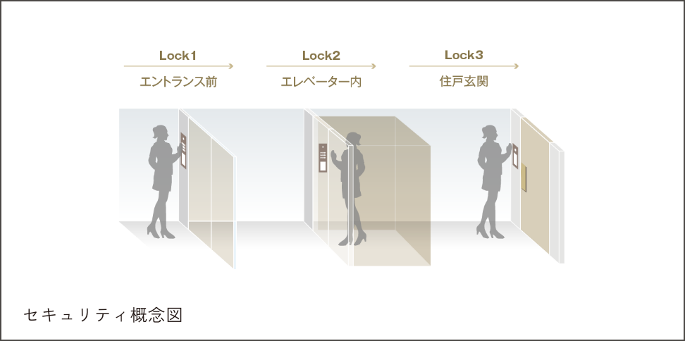 風除室、エレベーター着床制限、各住戸玄関の3段階で安全を見守るトリプルセキュリティを採用しました。
