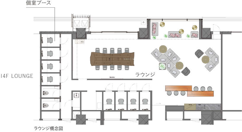 カウンターテーブルやソファー、小上がりスペースなど気分や用途で使い分けられます。